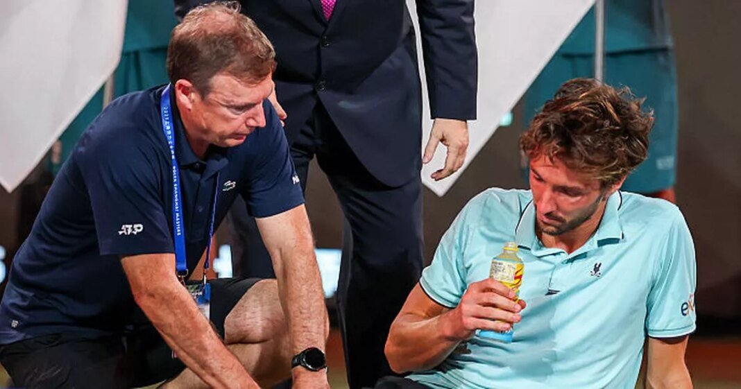 As staff members attended to Rinderknech, Vacherot continued his speech, thanking his support team and girlfriend. Rinderknech was provided with a chair and received treatment from a physio for his thigh as Vacherot concluded his address.