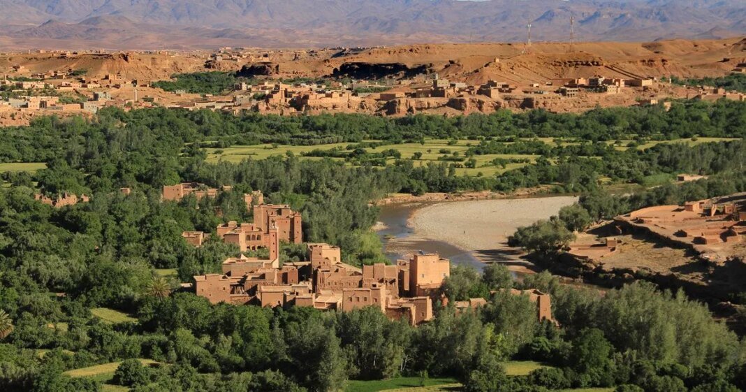 Nestled at the base of the High Atlas Mountains in southeastern Morocco, the Rose Valley, also known as M’Gouna, captivates visitors with its picturesque landscapes and flourishing Damask rose fields. The region relies on the M’Goun River for irrigation, sustaining local businesses that extract fragrances and cosmetics from the roses, creating a vivid contrast between the lush valley and the arid mountains.