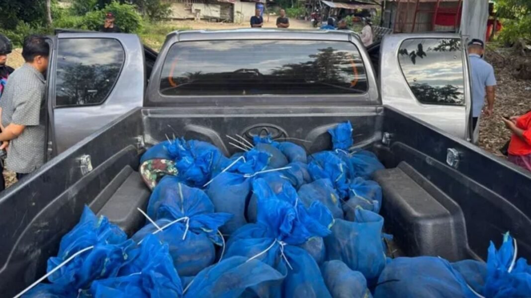 According to a statement on Facebook by the 12th Ranger Regiment of the Royal Thai Army, they pursued a “suspicious vehicle,” a dark grey Toyota Revo, along Road 3383 towards a remote area near the Cambodian border. The culprits were seen unloading the blue net bags containing monkeys and drugs with mutual assistance.